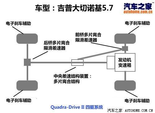 大切諾基采用前后整體橋的非獨立懸掛,這在結構在本身上也偏重越野。進入國內(nèi)的大切諾基有兩款車型,排量分別為3.7升和5.7升,兩款車型采用的四驅(qū)結構并不相同,主要體現(xiàn)在3.7升車型前后軸上沒有差速鎖,盡管它的電子輔助系統(tǒng)也足夠強大,但在通過一些難度較大的交叉軸項目時,電子輔助還是比機械結合反應緩慢一些。