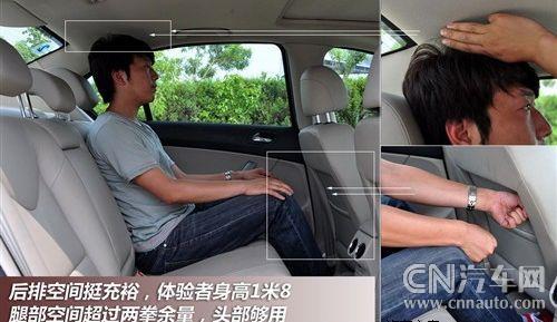 由于標(biāo)致408的軸距達(dá)到了2710mm,因此其后排擁有很寬松的乘坐空間。從上圖可以看到,體驗(yàn)者腿部前方將近兩拳半的活動(dòng)空間,可讓乘坐者任意擺出最舒適的姿勢。寬厚的后排座椅可為乘客提供舒適的駕乘感受,另外,在后排中央扶手箱內(nèi)還設(shè)置有一個(gè)內(nèi)藏式儲(chǔ)物格,可以放置一些體積不是很大的物品。