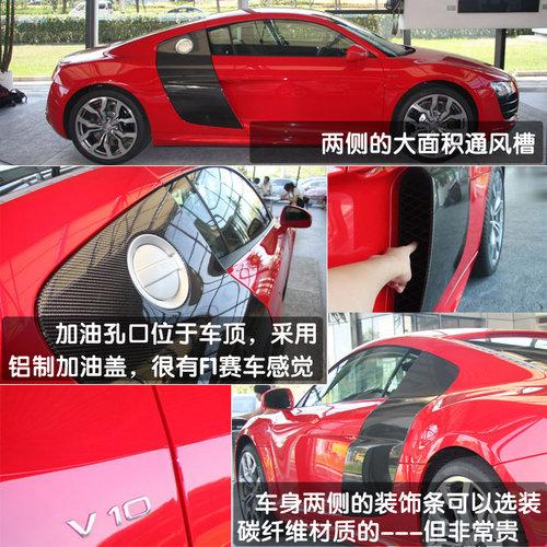 在車門后方,在輪拱和車頂之間,配有寬大的葉面側空氣進氣口,為V10發動機的進氣及冷卻提供足夠的風量。側邊風葉的漆面效果與車身的顏色配合得天衣無縫,當然如果你有特別的需求和足夠的金錢,也可以把普通材料更換為碳纖維材料而那一定會很酷!此外,例如朱鷺白、幻影黑以及珠光效果等8種個性顏色,都是R8的可選外觀色彩。