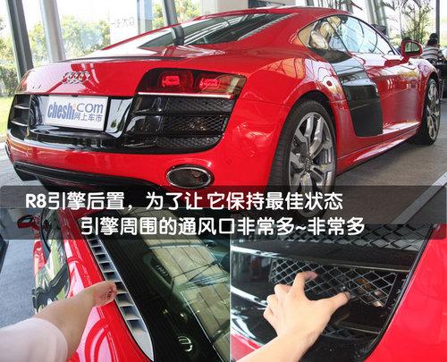 奧迪R8的駕駛艙相對靠前,而在駕駛艙之后則是巨大的引擎室——這是典型中置發動機賽車的特征,這種設計也大大優化了車身前后比例,使R8的前后重量分達到了44:56。透過R8后方透明的發動機罩,V10 5.2升FSI發動機安靜的伏臥其中。在設計師所營造的視覺效果下,人們很容易把它與賽車聯系在一起。即便在一個不了解賽車的人面前,也一定能從中看出它的與眾不同和獨一無二。