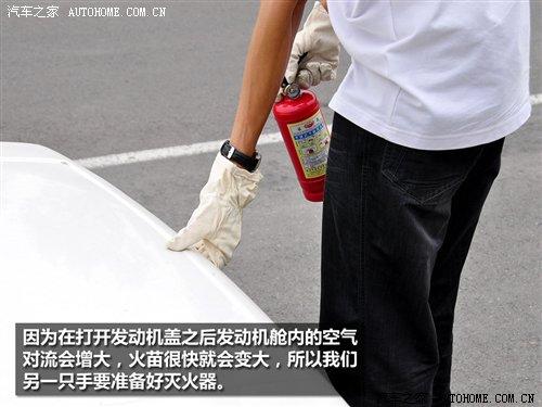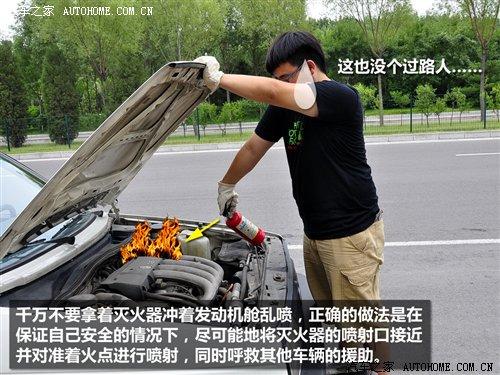 步驟三:發(fā)動(dòng)機(jī)蓋打開后由于空氣對流增強(qiáng),火苗會(huì)迅速變大,這時(shí)我們不能驚慌,拿著滅火器沖著發(fā)動(dòng)機(jī)艙亂噴,在保證自己安全的情況下,盡可能地將滅火器的噴射口接近并對準(zhǔn)著火點(diǎn)進(jìn)行噴射,同時(shí)呼救其他車型的援助(因?yàn)檐囉玫哪欠N小罐滅火器的容量有限)。
