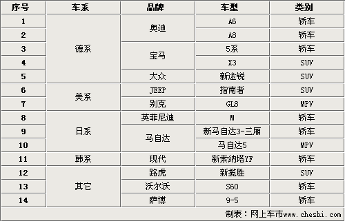 從上表我們可以看出,德系換代車型占據大部分,同時A6、A8、5系、X3和新途銳這五款車型都可以稱得上是重量級車型。其次是美系和日系車型都將分別推出兩款和三款換代車型,JEEP指南者、別克GL8和英菲尼迪新M、全新三廂馬自達3和全新馬自達5。現代汽車也將推出全新一代的索納塔YF,這應該是中國消費者接觸到的第三款車型了。同時路虎的新攬勝、沃爾沃的新S60和薩博全新9-5這些重量級車型也將相繼登場。在這些換代車型中轎車的比重比較大,共計8款車型。SUV為4款車型,MPV車型2款。