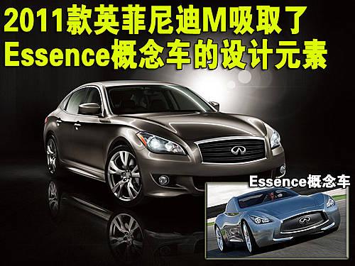 2011款英菲尼迪M在外觀設計上,吸取了在2009年日內瓦車展上展出的Essence概念車的設計元素。帶有上下拱形線條的長方形格柵,向后拉伸的L形大燈,發動機蓋兩邊巨幅隆起的動感褶皺以及優美流暢的腰線。新款M的車尾方面,第一印象給了我們一種強烈的捷豹風格,收縮的臀部以及尾燈都讓我們想起了捷豹XK的動感車尾。