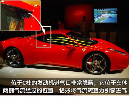 當(dāng)通過車身兩側(cè)的氣流經(jīng)過駕駛室后方的C柱時候,隱藏在C柱內(nèi)部的引擎進(jìn)氣口恰好在這里等待著新鮮的空氣。通過位于C柱內(nèi)的引擎進(jìn)氣口,發(fā)動機(jī)將獲得充足的新鮮空氣,并且法拉利的工程師還告訴我們:當(dāng)車輛的時速達(dá)到100公里/小時開始,由于氣流經(jīng)進(jìn)氣口以及進(jìn)氣道所產(chǎn)生的“動態(tài)增壓”效應(yīng),會使發(fā)動機(jī)的功率額外增加5馬力,最終實(shí)現(xiàn)570匹馬力的最大功率。