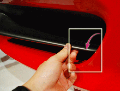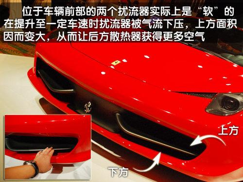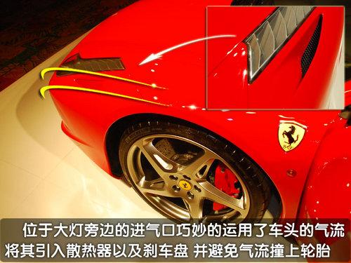 轉(zhuǎn)到車頭的上方您會發(fā)現(xiàn)在458Italia的大燈一側(cè)會有一個隱藏的通風(fēng)口,這里的設(shè)計能夠讓從車頭過來的氣流在經(jīng)過這里的時候進(jìn)入通風(fēng)口,使其變?yōu)橐嫔崞饕约扒拜唲x車系統(tǒng)的冷卻氣流,類似這樣的巧妙設(shè)計還有很多。
