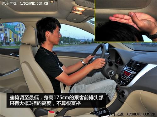圖中的體驗著身高175cm左右,在調整好合適的坐姿之后,前排頭部只有三指,而后排也僅僅3指,所以這點證明了流線型的車身線條還是會給頭部一些小的影響。當然,超長的軸距直接帶來了腿部空間的提升,作為小型車來說后排能達到兩拳的長度確實不多見。