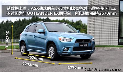 ASX勁炫是自2010年2月開始在日本銷售的豪華緊湊型SUV(RVR)的中國版車型。它繼承了帕杰羅的越野血統(tǒng),兼?zhèn)淞藲W藍(lán)德EX都市型SUV的性能。通過緊湊的車身設(shè)計(jì)、搭載的低油耗發(fā)動(dòng)機(jī)、以及鮮明運(yùn)動(dòng)風(fēng)格、加上18至24萬元之間的售價(jià)區(qū)間,使ASX勁炫在國內(nèi)同級(jí)別市場(chǎng)中有不錯(cuò)的競爭實(shí)力。