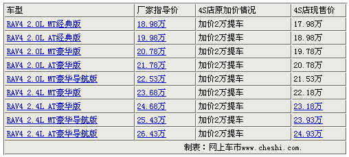 RAV4自去年4月份上市以來(lái),憑借超高的性價(jià)比得到眾多SUV車友的喜愛(ài),豐田RAV4是定位在一款城市SUV,它配置了主動(dòng)扭矩分配控制四輪驅(qū)動(dòng)系統(tǒng),同時(shí)兼?zhèn)湓诔鞘械缆泛驮揭奥范蔚膬?yōu)異行駛性能。據(jù)網(wǎng)上價(jià)格監(jiān)測(cè)系統(tǒng)顯示:豐田RAV4豪華升級(jí)版現(xiàn)已到店銷售,RAV4最高優(yōu)惠達(dá)到了15000元,最低僅售17.98萬(wàn),具體詳情請(qǐng)見(jiàn)下表: