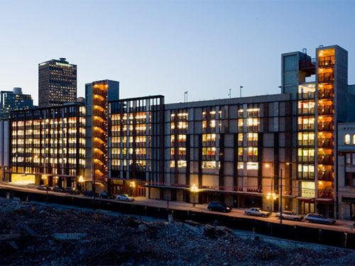 世紀之交,在火車站啟發的靈感下,建筑師設想了這個車庫項目,希望有助于重振溫哥華市中心。除了使用花崗巖和鋼作為建筑外觀,以更好地融入該城市的歷史外,設施的創新還在于外部的混凝土支撐,可以允許建筑內部的光線井和雨水過濾系統。