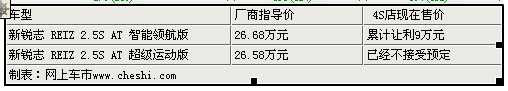 據北京一汽豐田4S店銷售人員介紹,目前銳志在售的2.5S車型全系可享受到3.5萬元的現金優惠,銳志 REIZ 2.5S AT特別紀念和2.5S AT/MT特別導航版現車供應充足,且主流的白、黑、紅、銀、蘭5種顏色齊全,另外店內推出智能領航版車型,該車與銳志的超級運動版(26.58萬元)配置完全相同,整車集成了智能導航系統、倒車影像、三屏DVD、遠程遙控啟動系統,車載冰箱、智能鑰匙系統、一鍵啟動、秘密鍵盤鎖、自動升窗、收鏡系統、安全防盜系統、引擎鎖定、智能升窗、震動感應、開門報警、行車下鎖、藍牙、運動擋泥板套裝等豐富配置,新增配置均為原廠配件。增配價值超出5萬元,該車市場指導價26.68元,現在購車優惠4萬元,該車數量有限,喜歡銳志的朋友這個時候出手最值。其余車型均已停產不接受預定。銷售人員還表示:在售的這三款車型是豐田銳志賣的最火的也是性價比最高的三款車型。2011款的銳志9月上市,現開始接受預定,消費者交訂金1萬便可排號提車。北京地區各4S店由于訂單不同,各店銷售的現車顏色有所不同。