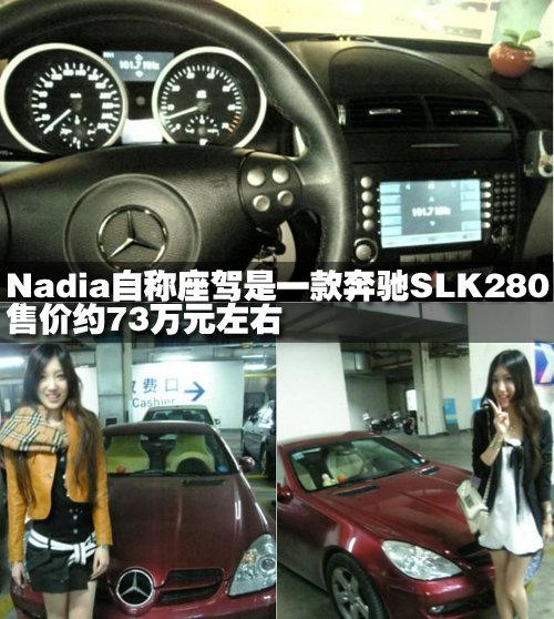 發帖人“fofo”自稱英文名字叫Nadia,卻并不透露中文姓名,Nadia的座駕是一款老款奔馳SLK280,搭載3.0升V6引擎,目前這款車型已經停產,當時的售價在73萬元左右。Nadia還表示自己的爸爸開BMW 7系,媽媽開奧迪車型,家里還有一部公用的商務車。