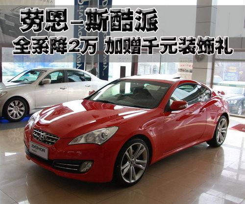 據(jù)北京進(jìn)口現(xiàn)代4S店銷售人員介紹,目前購買勞恩斯酷派全系最高優(yōu)惠現(xiàn)金2萬元,入門級車型優(yōu)惠后最低售價為17.9萬元。靚雅版升級真皮版就是在原來的靚雅版的基礎(chǔ)上加裝更加舒適耐用的真皮座椅,市場指導(dǎo)價比原來貴4000元。現(xiàn)車方面,店內(nèi)有2.0T AT豪華版和靚雅版升級真皮版有部分現(xiàn)車供應(yīng),現(xiàn)車顏色以蘭、紅、銀色為主。2.0T AT靚雅版、2.0T MT酷動版和3.7L車型需要預(yù)訂,訂金1萬元等待1-2個月可以提到新車。如消費者到店購買,在優(yōu)惠的基礎(chǔ)上加贈千元裝飾禮包。北京地區(qū)各4S店由于訂單不同,各店銷售的現(xiàn)車顏色有所不同。