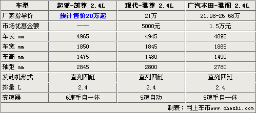 據北京地區進口起亞4S店銷售人員透露,起亞的全新中級轎車凱尊與廣汽本田的雅閣一個級別,預計低配車型的售價在20萬元起。目前4S店現已開始接受預訂,訂金1萬元,第一批車主將于8月底提到現車。同時從上表的數據看出,起亞凱尊的車身尺寸與同平臺現代雅尊和本田雅閣相比,是尺寸最大的,同時軸距也是三款車型中最長的,這意味著它的車內空間是最寬敞的。三款車型的發動機形式都是直列四缸2.4L的發動機,變速器方面則是凱尊明顯占有優勢,配備的6速手自一體變速器。由以上數據看,如果起亞凱尊定價合理的話,上市后會有不錯的成績。下面就讓我們提前去感受一下即將上市的起亞Cadenza凱尊。