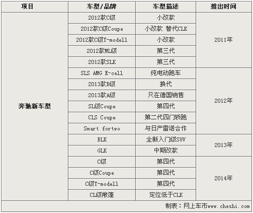 雖然奔馳全新一代CLS轎跑車將在巴黎車展發布,但是正式上市還要等到明年,而在2012年奔馳全新一代CLS雙門轎跑車也將推出。而已在國內投產的奔馳新C級轎車將于明年推出小改款車型,在2014年將陸續推出全新一代C級轎車以及酷派和旅行版車型。此外,作為奔馳入門級SUV的BLK車型將于2013年正式推出,從進一步抗衡寶馬X1等競爭車型。