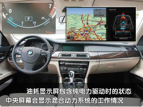 在儀表臺部分混合動力7系轎車的油耗顯示區域與普通車型明顯不同,它的指針從“Active HyBrid ”開始,指針指向這個部分的時候代表并不會消耗燃油。而混合動力7系轎車的電機部分并不能單獨支撐車子行駛很長的時間,它更多的作用是為了輔助引擎,以及在車輛制動和滑行過程中收集制動能量轉化為電能儲存在電池中。