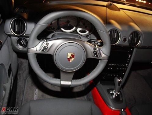 雖然比不上911強悍的性能,但車頭金光燦燦的斯圖加特徽標仍舊讓你心動不已,而當敞篷成為潮流時,這對可愛的如青蛙眼睛的頭燈仍然會向我們展示一款個性豪華小跑所能體現的一切。對于中置發動機的車型而言,設計在后輪拱前方的進氣口既能增加視覺效果,又能產生實際功效。進入入車內,Boxster少量銀色金屬裝飾夾雜在純黑內飾當中,真皮包裹被細密的縫合線緊束在各部件表面,我們不知道如何形容,豪華是肯定的,但卻蘊含著保時捷的一種獨特個性在里面。沒有張揚,但那份豪華逼人的氣質之下更多是一種世界著名品牌的運動實力。