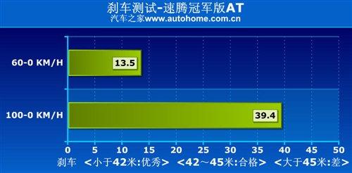 冠軍版與速騰其他車型相比剎車的優勢比較明顯,車重大于速騰1.4TSI,但實際的制動距離短了1米,寬胎起了直觀重要的作用,在剎車時輪胎與地面接觸面積大,保證了足夠的摩擦力;10次連續制動測試,冠軍版剎車系統表現出的穩定性也讓我們放心,距離偏差很小。