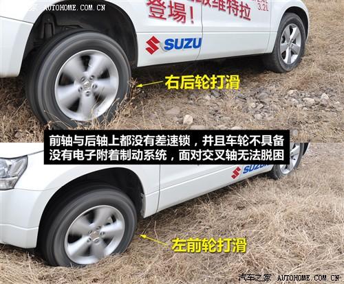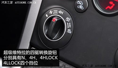 超級維特拉帶有中央差速器,正常行駛時為全時四驅模式,并可通過位于中控臺上的旋鈕來鎖止中央差速器,不過,該車并沒有左右輪間限滑裝置,面對交叉軸項目時還是無能為力,但是依靠發動機強勁的動力行駛在普通的非鋪裝路面上還是問題不大的。
