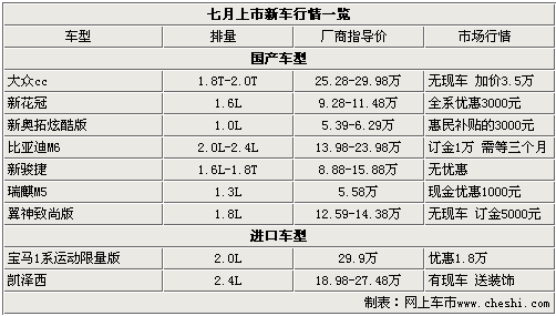 7月份上市的新車型中聚集了眾多知名大品牌。如一汽大眾、鈴木、一汽豐田等。而按照車型細(xì)分,其中涵蓋各個(gè)級別的車型,其中自品牌有3款車型上市,分別是比亞迪M6、新駿捷;瑞麟M5;合資車型包括一汽大眾CC、、三菱翼神、新花冠,進(jìn)口車型鈴木凱澤西和寶馬1系運(yùn)動(dòng)限量版,共計(jì)9款車型。