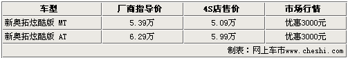 新奧拓炫酷版與普通版新奧拓車(chē)型相比,外觀(guān)、內(nèi)飾及配置方面均有明顯變化。炫酷版新奧拓車(chē)型新增了車(chē)頂擾流板、前后以及兩側(cè)運(yùn)動(dòng)包圍、側(cè)面防擦條,內(nèi)飾方面添加了炫彩裝飾套件、靈炫動(dòng)感座椅以及深色尚酷內(nèi)飾,配置方面將原有音響CD升級(jí)為GPS智能導(dǎo)航+音頻輸入接口。