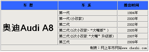 Audi A8是奧迪汽車的豪華旗艦車型,與其競爭對手梅賽德斯-奔馳S級以及寶馬7系相比,奧迪A8還很“年輕”。說起A8的歷史,自1994年推出至今僅有十余年,但不得不承認的是奧迪A8成長的很快,從低調到張揚大膽的創新設計引領了豪華轎車的發展方向。下面我們就一同來了解下這款“年輕”旗艦車型的歷史。