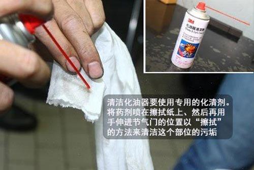 在早期,一般師傅使用化清劑的方式進行清洗時,會直接朝節氣門內部做噴灑的清潔動作。而這次我們使用擦拭的方式來進行。這是因為化清劑會腐蝕塑膠、橡膠類的材料,而且還會將所有的潤滑油通通溶解。所以噴灑的方式雖然面積可以更廣泛、但日久也會造成內部機件的損傷,容易造成怠速步進馬達、油封等問題。