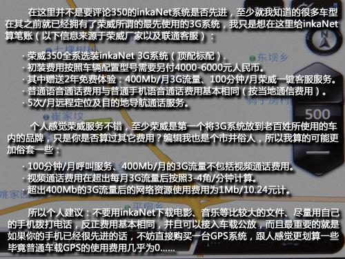 不同于那些高端品牌的汽車的3G系統,350提供了更多的3G服務,比如語音/視頻通話、影音服務、GPS定位等等各種服務,當然可能因為筆者僅僅是個市井小生,所以對于350的3G系統的費用,我一直持保留意見,畢竟贈送100分鐘的通話時長聽上去不錯,但它僅僅支持與榮威客服的通話,這點讓我感覺這免費通話時長跟沒有沒太大區別。