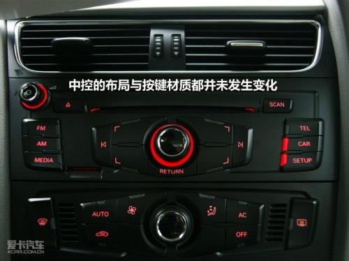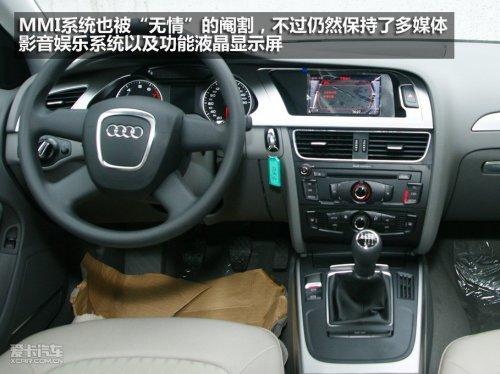 MMI多媒體影音導航系統也被閹割,排擋桿后面空空的塑料飾板顯得有一點點刺眼。不過音響系統與更高版本相比并無變化,而自動空調則取消了雙溫區劃分功能。不過無論是面板材質還是整體制造工藝,完全保留了奧迪嚴謹豪華的風格,質感強烈的同時裝配嚴絲合縫,旋鈕的阻尼力度也十分適中。