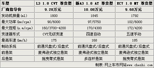 帝豪EC7的最大功率高于其他兩款車型,并且配備了五速手動變速箱,能擁有185km/h的最高車速是比較正常的。相對而言,奇瑞A3的動力優勢并不明顯,再配備四速自動變速箱,動力和經濟性也明顯不如其他兩款車型。比亞迪L3的發動機雖然功率比較小,但CVT無級變速箱給這款車加分不少,而且通風盤式制動也不遜于其他產品。