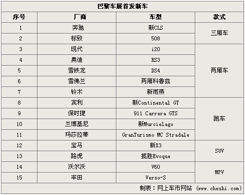2010巴黎車展將于9月底正式開幕,本屆車展新車云集,數十款新車將在車展全球首發,包括奔馳、寶馬、標致等歐洲本土廠商,也有雪佛蘭、豐田等海外廠商。而這次在開幕前我們所盤點的是巴黎車展首發后將引入國內銷售的新車,預計將有15款首發車后續引入。