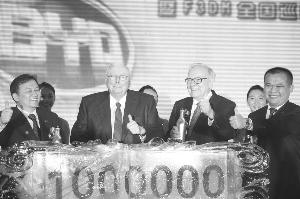 比亞迪總裁王傳福(左一)、巴菲特(右一)等出席比亞迪汽車第100萬輛銷售慶典 上海證券報傳真圖