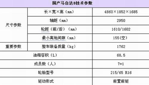 資料顯示,國產馬自達8的車身尺寸為長4860mm;寬1852mm;高1685mm,最多可以容納8人,遠遠超過B級轎車的2950mm軸距保證了足夠的后排空間。