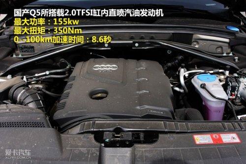 目前四款國產奧迪Q5車型搭載與A4L高功率版相同的2.0TFSI發動機,應用了渦輪增壓、缸內直噴和AVS可變氣門升程系統,最大輸出功率為155kw/4300-6000rpm,在1500至4200轉可持續輸出350Nm的最大扭矩。奧迪Q52.0TFSI由靜止加速到100公里/小時僅需8.6秒,最高車速222公里/小時,百公里綜合油耗僅為9.9升。