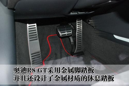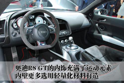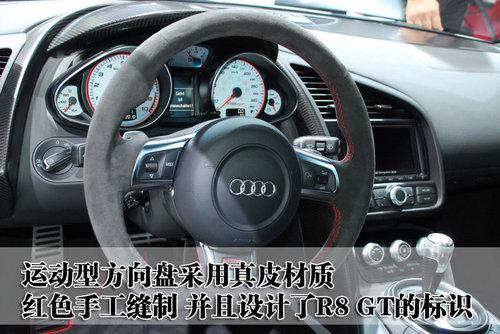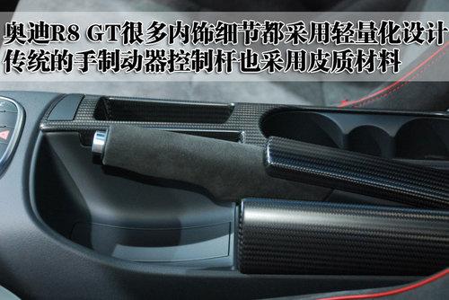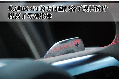 奧迪R8 GT深色調的內飾風格充滿了運動元素,車內壁很多的都是選用輕量化的材料打造,而且內飾的材料都非常柔軟,避免在車內出現磕磕碰碰時受傷。奧迪R8 GT的運動型方向盤配備了換擋撥片,采用真皮材質,并且采用手工縫制。
