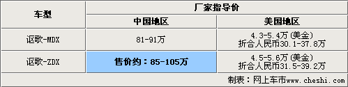 謳歌SUV車型MDX和謳歌跨界車ZDX同屬于一個(gè)級(jí)別的車型,它們的軸距都是2750mm。但是謳歌ZDX的車身要比MDX長(zhǎng),而身高度則低于MDX,這樣的設(shè)計(jì)完全符合跨界車(運(yùn)動(dòng)型多功能跑車)的定位。目前謳歌MDX在中國(guó)地區(qū)的售價(jià)為81-91萬(wàn),通過(guò)謳歌MDX在美國(guó)地區(qū)的售價(jià),我們預(yù)計(jì)謳歌ZDX引入中國(guó)地區(qū)的售價(jià)約為85-105萬(wàn)(謳歌ZDX目前美國(guó)地區(qū)的指導(dǎo)價(jià)為4.5-5.6萬(wàn)美金,折合人民幣為31.5-39.2萬(wàn)元)。