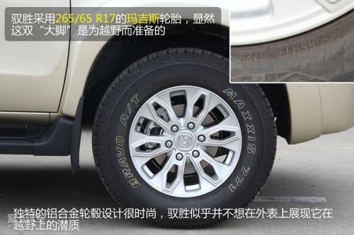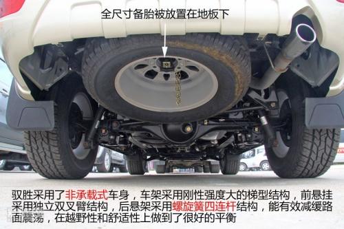 馭勝采用了非承載式車身,車架采用剛性強度大的梯型結構,前懸掛采用獨立雙叉臂結構,后懸架采用螺旋簧四連桿結構,能有效減緩路面震蕩,這樣的設計在越野性和舒適性上會有很好的平衡。