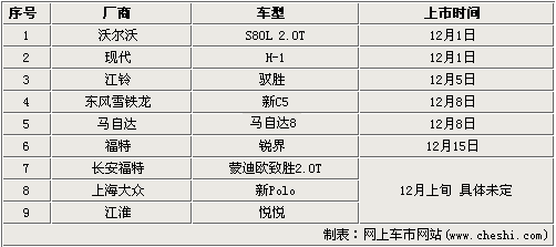 其中,在12月1日就將有兩款新車上市,分別為S80L 2.0T和現代H-1,另外還有江鈴馭勝、新C5、馬自達8等三款新車也確定了具體上市時間,而江淮悅悅、新Polo、GX2等4款車上市時間未定。從上表可以看到,這9款新車涵蓋了小型車、中級車、豪華車、SUV及商務車等不同類型,可以滿足消費者各項用車需求。