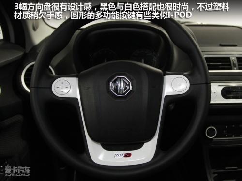 MG3的三幅方向盤設計非常出色,黑白顏色搭配十分年輕,只是采用硬質塑料材質手感欠佳。圓盤形的多功能按鈕與蘋果I-POD音樂播放器十分相似,正是當下年輕人最喜愛的設計風格。相比之下儀表的設計稍顯普通,液晶顯示面板的面積也比較小。