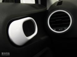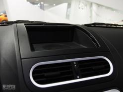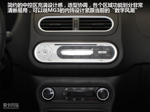 中控區域,出風口與音響、空調兩個功能區塊造型風格保持一致,簡約而富有整體感。特別是音響控制面板,白色的面板和同樣類似于蘋果音樂播放產品的風格,相信會吸引大批追求時尚的年輕人。另外雖然這款展車為MG3低配車型,但仍然安裝了自動空調。