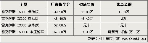 據(jù)4S店銷售人員介紹,目前雷克薩斯IS300系列有普通轎車和敞篷硬頂跑車兩個(gè)系列,其中敞篷跑車的售價(jià)已經(jīng)公布,售價(jià)為67.3萬元,各經(jīng)銷商處可以接受預(yù)訂,訂金為3萬-5萬不等,7月首批新車即可到店。據(jù)銷售人員介紹哦G-BOOK智能副駕系統(tǒng)是這款車的最大亮點(diǎn)。同時(shí)轎車版三款車目前只有IS300選動(dòng)版現(xiàn)車供應(yīng),最高可優(yōu)惠現(xiàn)金2萬元。同時(shí),部分經(jīng)銷商還推出了購(gòu)車送一年全車保險(xiǎn)的活動(dòng),保險(xiǎn)金額在1萬-2萬之間。
