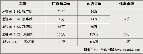 途銳是大眾首款引進我國的SUV車型,在3.6L及4.2L率先上市后,大眾為了滿足消費者的更大胃口,緊接著又推出了搭載12缸發動機的6.0L車型。隨著大排量消費稅的頒布,給9月份后入關的大排量車型帶來了一次不小的沖擊,令大排量汽車價格都上調了不少,大眾途銳6.0L頂級版也從原來158萬元的價格上調至了180元。近日據網上車市價格數據監測顯示,大眾途銳全系的最高優惠達到了15萬元,具體詳情請看下表: