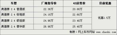 據(jù)北京地區(qū)廣州本田4S點(diǎn)銷售人員表示,目前銷售的08款?yuàn)W德賽現(xiàn)已全部停產(chǎn),各個(gè)4S店均在銷售庫存車輛,由于貨源緊張,優(yōu)惠幅度較前一陣明顯有所減少,全系車型均只優(yōu)惠1.5萬元(4月優(yōu)惠幅度高達(dá)2.2萬元)。消費(fèi)者現(xiàn)在購車除了可以得到現(xiàn)金優(yōu)惠外,還可以得到商家贈(zèng)送的原廠汽車裝飾。在現(xiàn)售的四款?yuàn)W德賽車型中,普通版座椅為絨布材質(zhì),其他三款均為真皮材質(zhì),現(xiàn)車多以黑色和銀色為主。