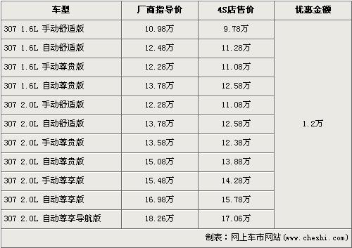 2007年9月22日,全新一代的東風標致307在眾多消費者的熱切期盼中新悅登場。新東風標致307全系多達九種顏色共十三款車型,價格從10.98萬元--16.58萬元。近日根據(jù)網(wǎng)上車市價格監(jiān)測系統(tǒng)顯示,現(xiàn)在三廂標致307全系優(yōu)惠1.2萬元,具體車型以及價格如下: