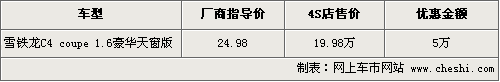 據4S店銷售人員介紹,目前銷售的C4轎跑車只有頂配1.6豪華天窗版,店內有銀色和紅色現車供應,數量有限。頂配版原來廠商指導價格為24.98萬元,現在售價僅為19.98萬,直降5萬元現金,車價不足20萬元。