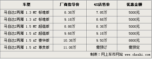 據4S店銷售人員介紹,目前馬自達2兩廂車型全系優惠幅度在5000元-8800元之間,其中1.3兩款車型、1.5超值版和豪華版可以優惠現金5000元,入門級車型優惠完以后售價為7.85萬,車價已經跌破了8萬元。1.5自動豪華版車型優惠幅度達到了最高的8.8萬,而尊貴版車型還需要消費者預訂。目前超值版車型供貨比較充足,顏色也較為齊全,詳情消費者可到店咨詢。