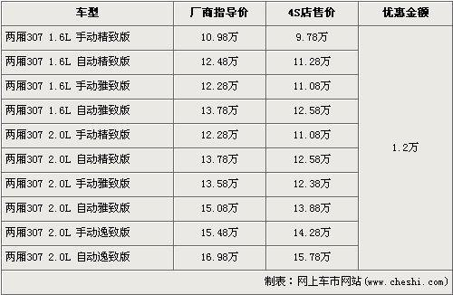 據東風標致經銷店銷售人員介紹,兩廂標致307分為1.6L和2.0L兩種排量,目前全系優惠1.2萬元,入門車型的1.6L 手動精致版原廠商指導價為10.98萬元,經優惠后僅售9.78萬元,排量稍大的2.0L排量的低配車型手動精致版經優惠后售價為11.08萬元。