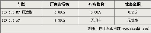 據(jù)比亞迪汽車北京地區(qū)4S店銷售人員介紹,目前北京在售的比亞迪F3R有兩款車型。1.5L手動舒適版經(jīng)2000元的優(yōu)惠后售價從6.08萬降到了5.88萬元,1.6L自動檔車型目前店內(nèi)沒有現(xiàn)車,所以不再此次優(yōu)惠隊列中。