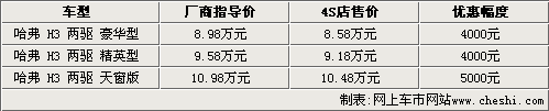 據長城汽車4S店銷售人員介紹,長城哈弗H3的現車都比較齊全,并且出現了較多的優惠幅度。其中豪華型和精英型能夠優惠4000元,而天窗版則優惠5000元。另外銷售人員表示,長城哈弗H3的廠商指導價只是白色普通漆車型,金屬漆其他顏色車型需要加價2000元。