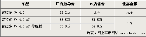 普拉多是一款大尺寸的SUV,皮實(shí)的外觀和超強(qiáng)的越野性能一直備受消費(fèi)者的歡迎,但是普拉多產(chǎn)量并不多,市場上現(xiàn)車的數(shù)量非常少,同時(shí)各經(jīng)銷商引入的車型也有相應(yīng)差別。根據(jù)網(wǎng)上車市價(jià)格監(jiān)測系統(tǒng)顯示,目前普拉多只有4.0排量車型有部分現(xiàn)車,數(shù)量有限,車源比較緊張,具體行情如下: