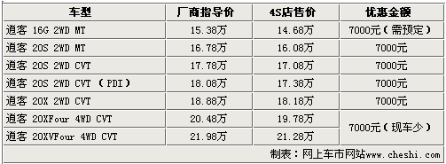 東風(fēng)日產(chǎn)推出的逍客車型是在國內(nèi)第一款真正意義上的跨界車,這款車既擁有SUV的時尚外觀和通過性,又有轎車的舒適性和省油優(yōu)勢。根據(jù)網(wǎng)上車市價(jià)格監(jiān)測系統(tǒng)顯示,目前在北京地區(qū)購買逍客的消費(fèi)者,可以享受到全系7000元的現(xiàn)金優(yōu)惠,但是1.6L車型需預(yù)定。具體車型以及價(jià)格如下: